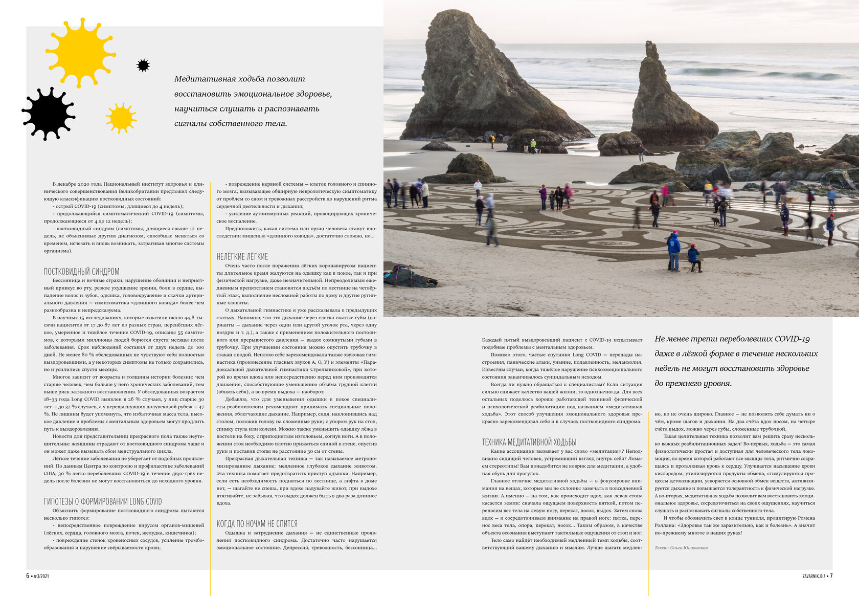 Всегда ли нужно обращаться к специалистам? Если ситуация сильно снижает качество вашей жизни, то однозначно да. Для всех остальных поделюсь хорошо работающей техникой физической и психологической реабилитации под названием «медитативная ходьба». Этот способ улучшения эмоционального здоровья прекрасно зарекомендовал себя и в случаях постковидного синдрома.